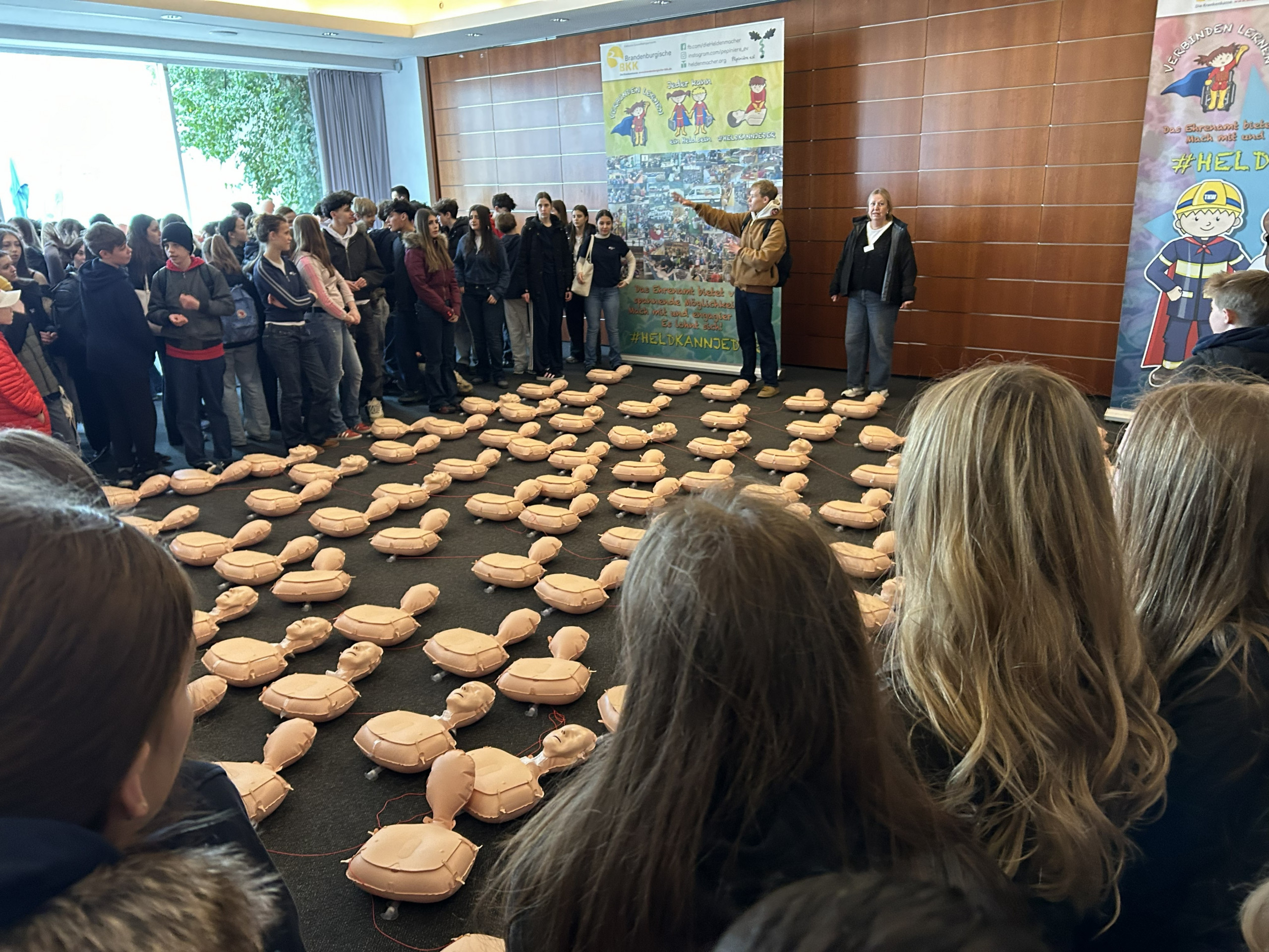 Ein besonderes Highlight war die gemeinsame Reanimationsübung mit rund 200 Schülerinnen und Schülern zur Musik von „Staying Alive“ – ein eindrucksvolles Bild für aktives Lernen und kollektive Verantwortung.