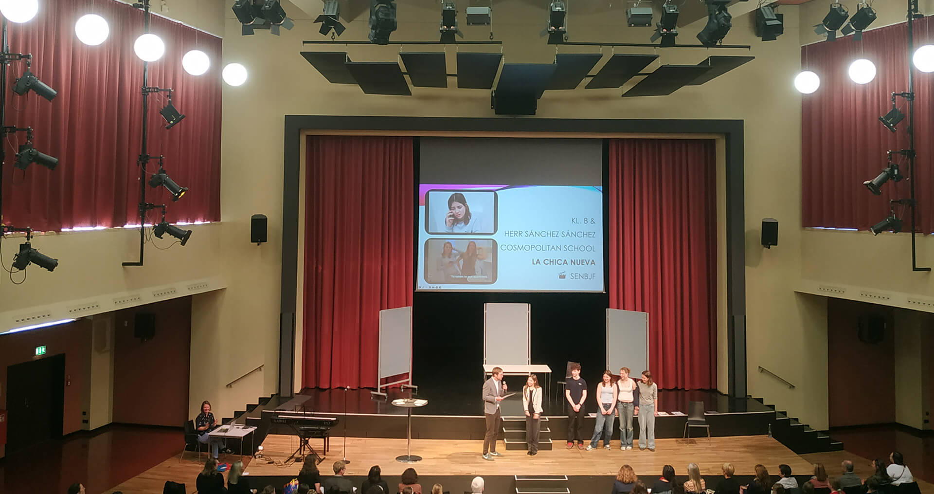Mit ihrer kreativen und eindrucksvollen Eigenproduktion „La chica nueva“ hat die 8. Klasse der Berlin Cosmopolitan School beim Bundeswettbewerb Fremdsprachen in der Kategorie Team Spanisch den 1. Preis gewonnen. Die feierliche Preisverleihung fand am 20. Mai 2025 in der Aula der Max-Taut-Schule in Berlin statt – und unsere Schüler:innen standen dabei im Rampenlicht.