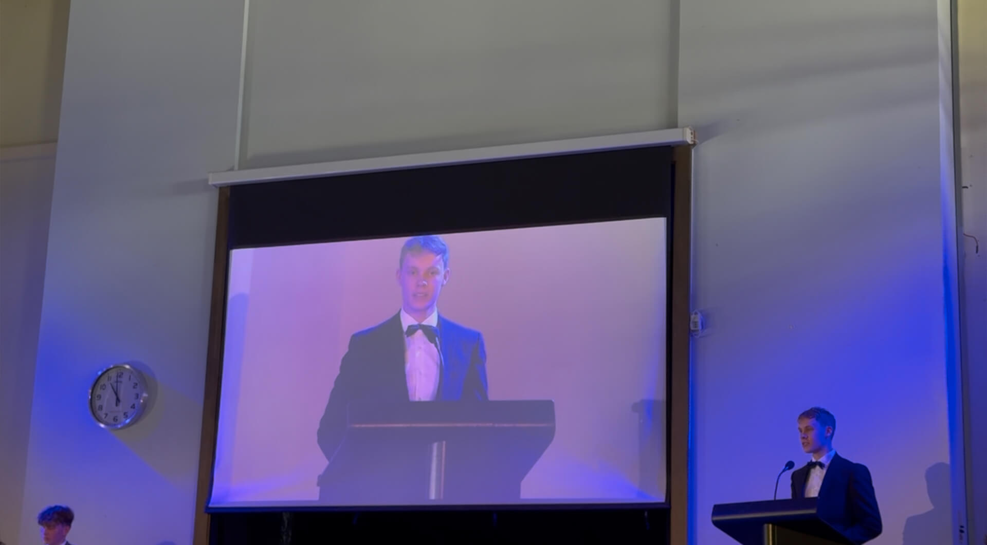 Cosmopolitanschool Berlin Ein Mann im schwarzen Smoking steht an einem Podium und hält eine Rede bei BALMUN 2025. Sein Bild wird auf einer großen Leinwand hinter ihm angezeigt. Der Raum ist blau beleuchtet, links ist eine Wanduhr zu sehen.